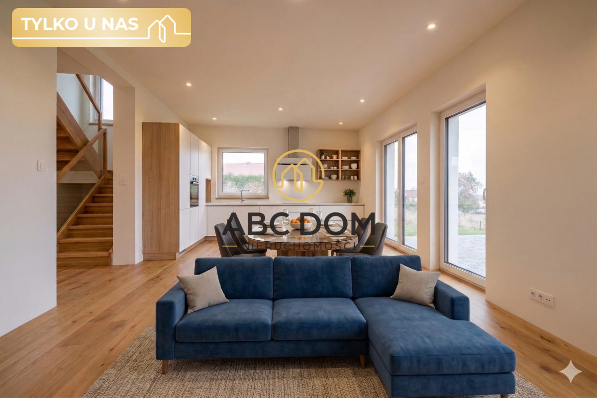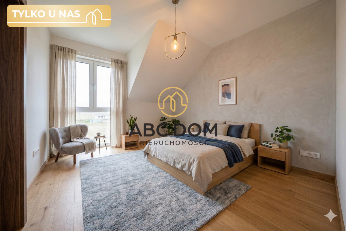 Dom w zabudowie bliźniaczej. Parterowy z poddaszem użytkowym. Oddany do użytku 2025r o łącznej pow. użytkowej 123,92m2 (pow. całkowita 134,62). Dodatkowo strych o pow. ok. 30m2. Budynek posadowiony na działce o pow. ok. 500m2) Dom od strony ogrodu znajduje się na lekkim wzniesieniu dlatego też ma przyjemny widok na otaczającą zieleń i domy w oddali. Podjazd wyłożony kostką. Z tyłu taras. Dookoła zadbany trawnik. Istnieje możliwość parkowania dodatkowego auta przed garażem.