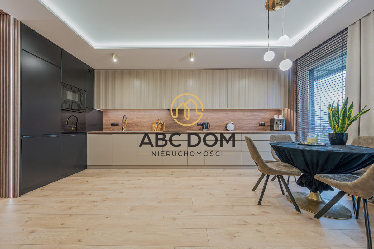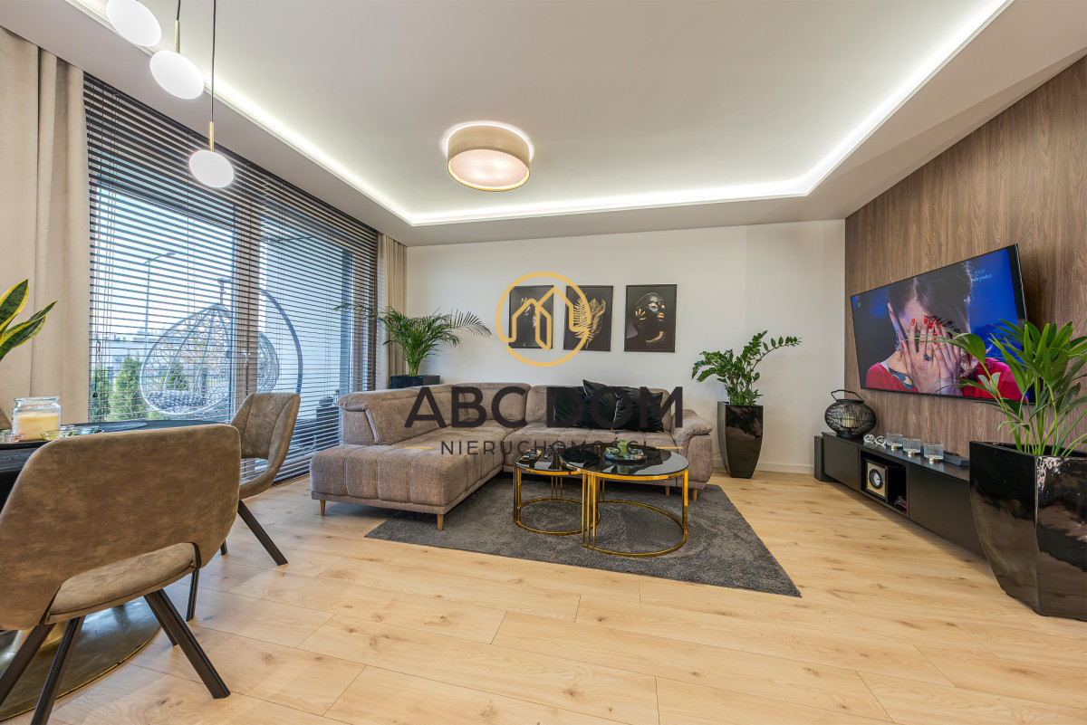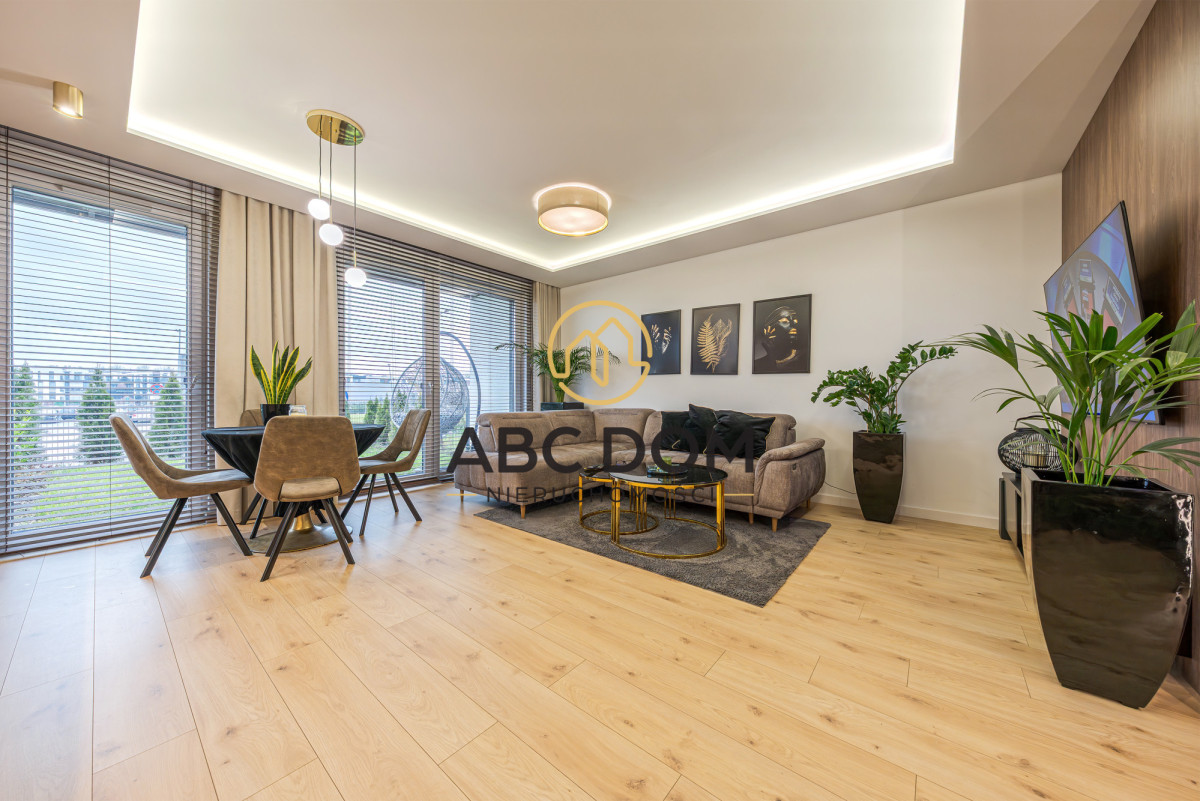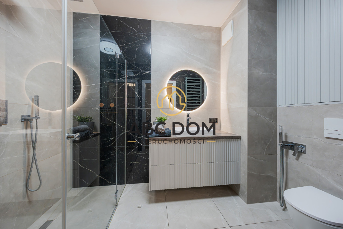 W salonie podwieszane sufity z oświetleniem LED. W każdym z pokoi oraz przedpokoju znajdują się obszerne szafy na wymiar do przechowywania rzeczy. Pomieszczenie gospodarcze posiada pralkę i suszarkę firmy Samsung i dodatkowe miejsce na art gospodarcze. Łazienka elegancka z dużą kabiną prysznicową typu walk-in, na podłodze położone zostały włoskie duże kafle. Wszystkie drzwi w mieszkaniu są firmy DRE.