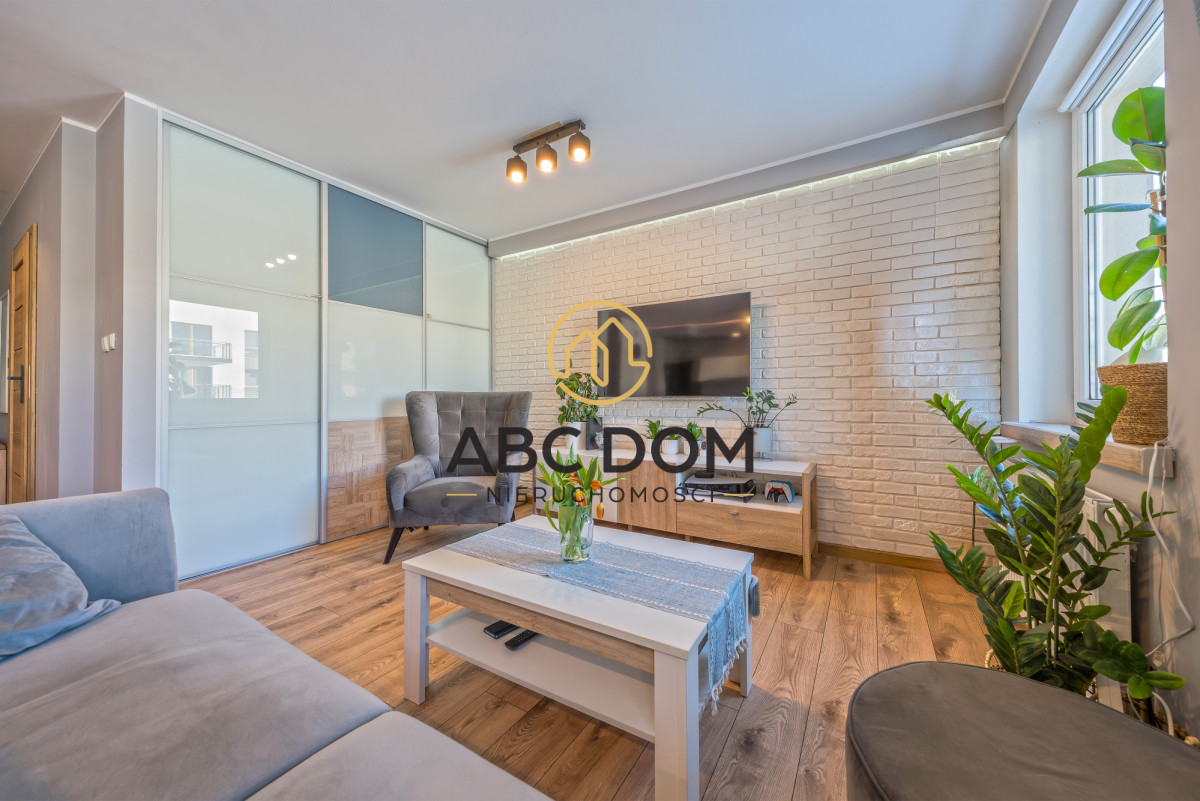 Przestronny z zabudową typu Komandor, na ścianie ceglane wykończenie podświetlane od góry nowoczesny oświetleniem - listą LED. W salonie znajduje się kanapa, rtv-ka oraz ława.