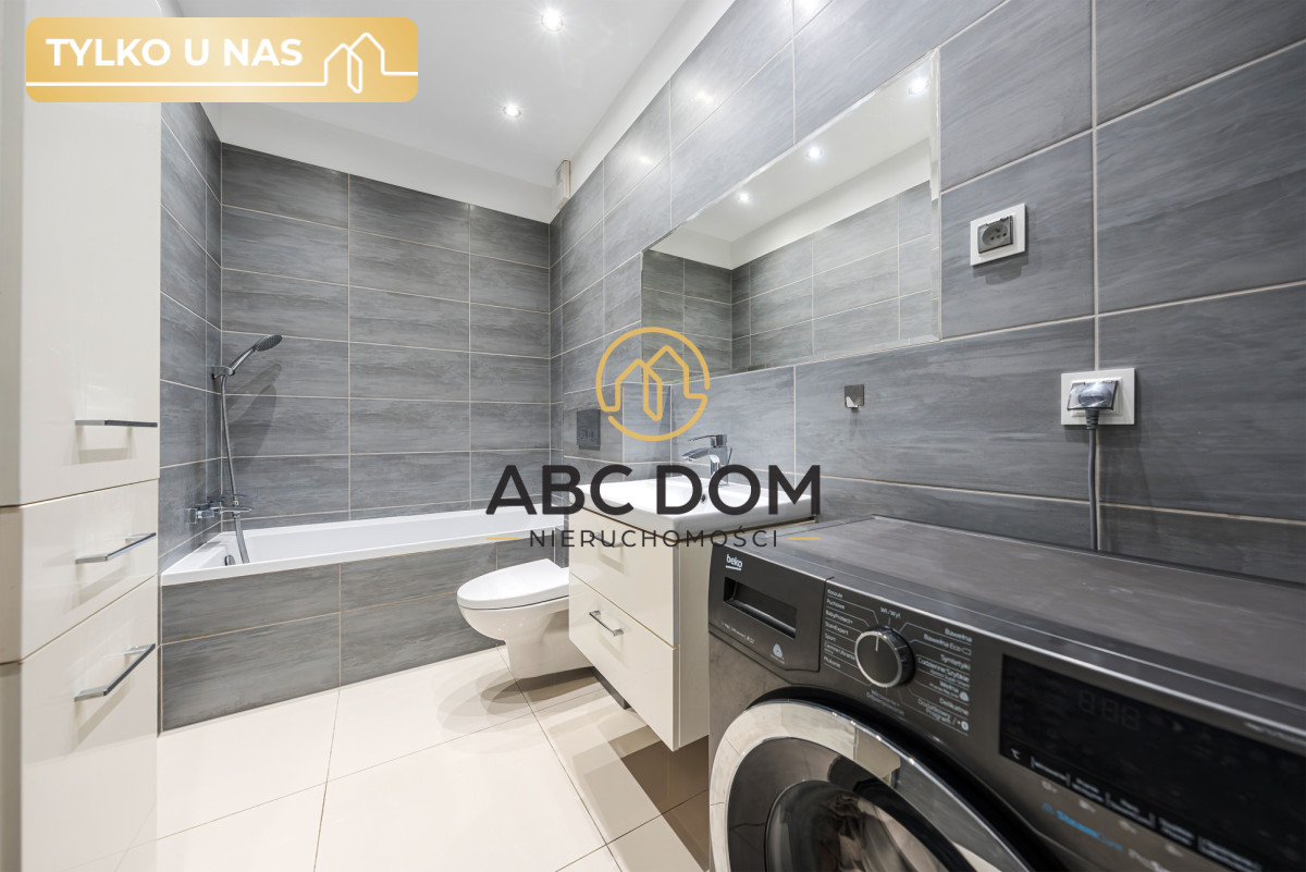 W łazience na wyposażeniu wanna, szafki oraz pralka firmy Beko.