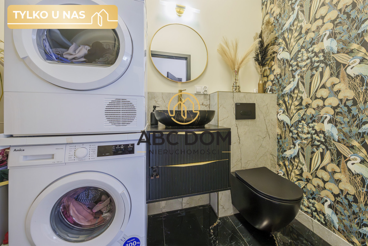 Łazienka z WC i pralnią posiada piękną czarną i złotą armaturę. W pomieszczeniu znajduje się szafka, umywalka nablatowa, lustro, gazowy piec/kocioł gazowy dwufunkcyjny marki Saunier duval oraz pralka i suszarka marki Amica.